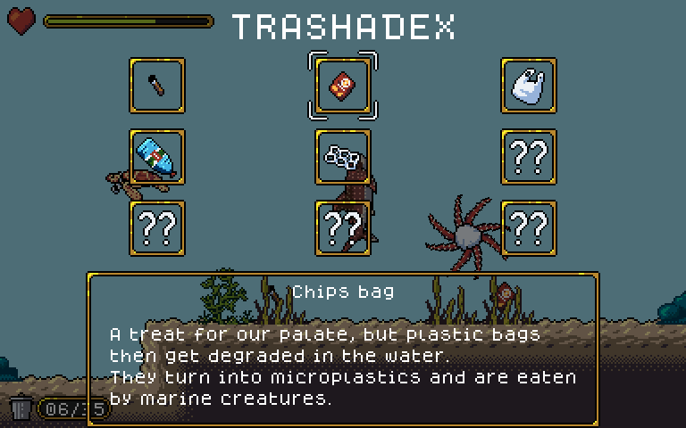 You also possesses a TRASHADEX, a trash encyclopedia that lets you see the different types of trash you already collected.